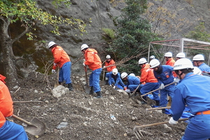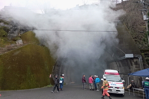 高吾北消防本部・愛媛県久万高原町消防本部による、救急救助合同訓練が仁淀川町大渡ダムにある高瀬トンネルにおいて実施されました。今回の訓練ではトンネル内にてバスが自転車を撥ねた後、車両2台に次々と衝突し多数の傷病者が出ているとの想定であり、トンネル内では無線や声の反響が大きく情報収集が困難であるなど課題も見え、両消防本部にとって非常に有意義な訓練ができました。 |