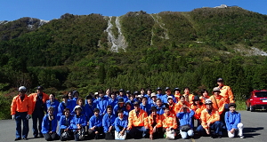 平成30年10月13日(土)、管内女性防火クラブ研修が仁淀川町にある鳥形山にて開催されました。担当者の説明で、日本屈指の石灰鉱山として知られる鳥形山は、良質な石灰岩を含む秩父古生層の石灰山で、日鉄鉱業により年間1,400万トン余りの採掘が行われ、露天掘り日本一の産出量を誇っていることや、開発前に1,459mあった標高は、長年の採掘によって約200m低くなり、まだ後100年は採掘できるとの話を聴き、山頂では眼下に広がる広大な採掘現場や、180トン積ダンプなどの重機を目の当たりにし、各防火クラブの会員たちはめったに見ることのできない世界に足を踏み入れ、感心したり驚きの表情を見せていました。今回の研修は、好天に恵まれ1,000mを超える高い山にも関わらず気温も上昇、管内7クラブ50名の参加者にはとても良い研修になったと思います。 |